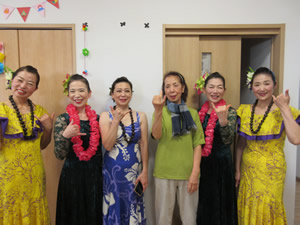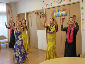 今月は新年会を行いました。フラダンスのボランティア様にきて頂き素敵なダンスをみせて頂きました。